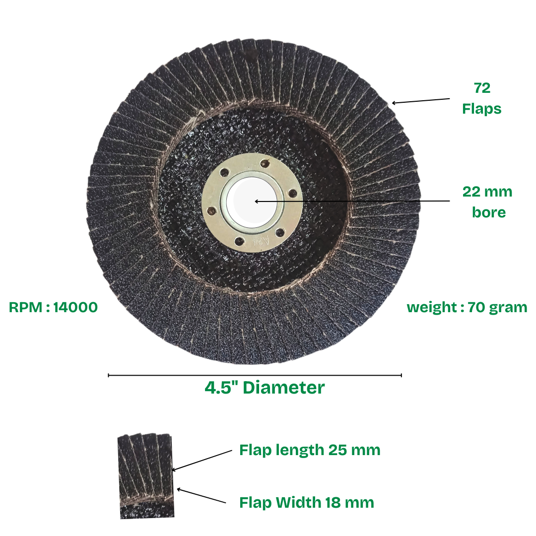 - Fits on all angle grinders. 4.5 inch diameter, 22 mm bore, Weight 70 gram.