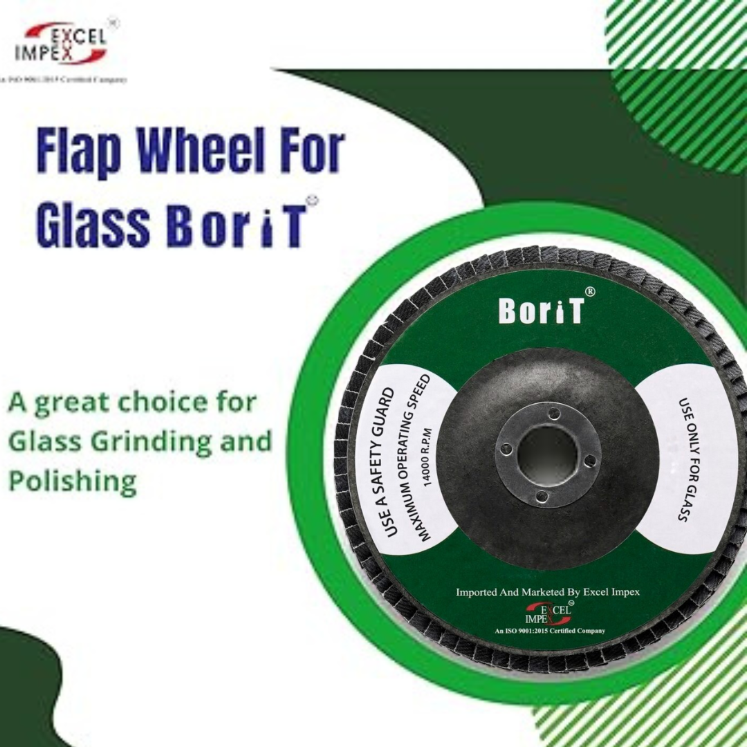 A Borit Flap Wheel is made with silicone abrasive grain cross pads bonded to a sturdy base disc. In glass beveling, the flap wheel is used after rough grinding with a grinding wheel. It creates a semi-mirror finish on the glass before the final polish with cerium oxide or chrome oxide slurry. The highly dense, overlapped cross pads ensure the required stock removal. The flap wheel’s flexibility is advantageous for smoothing curved profiles. Flaps made with an appropriate percentage of silicon carbide and corundum, bonded with a suitable resin, make this product ideal for glass grinding and semi-polishing. The appropriate grit size is used for semi-finishing. For the final finish, apply cerium oxide with a non-woven felt pad/disc. It is recommended for dry grinding. A bore Adjuster is also provided to reduce the bore size and fit all angle grinders. Diameter: 4.5 inches, Bore: 22 mm.