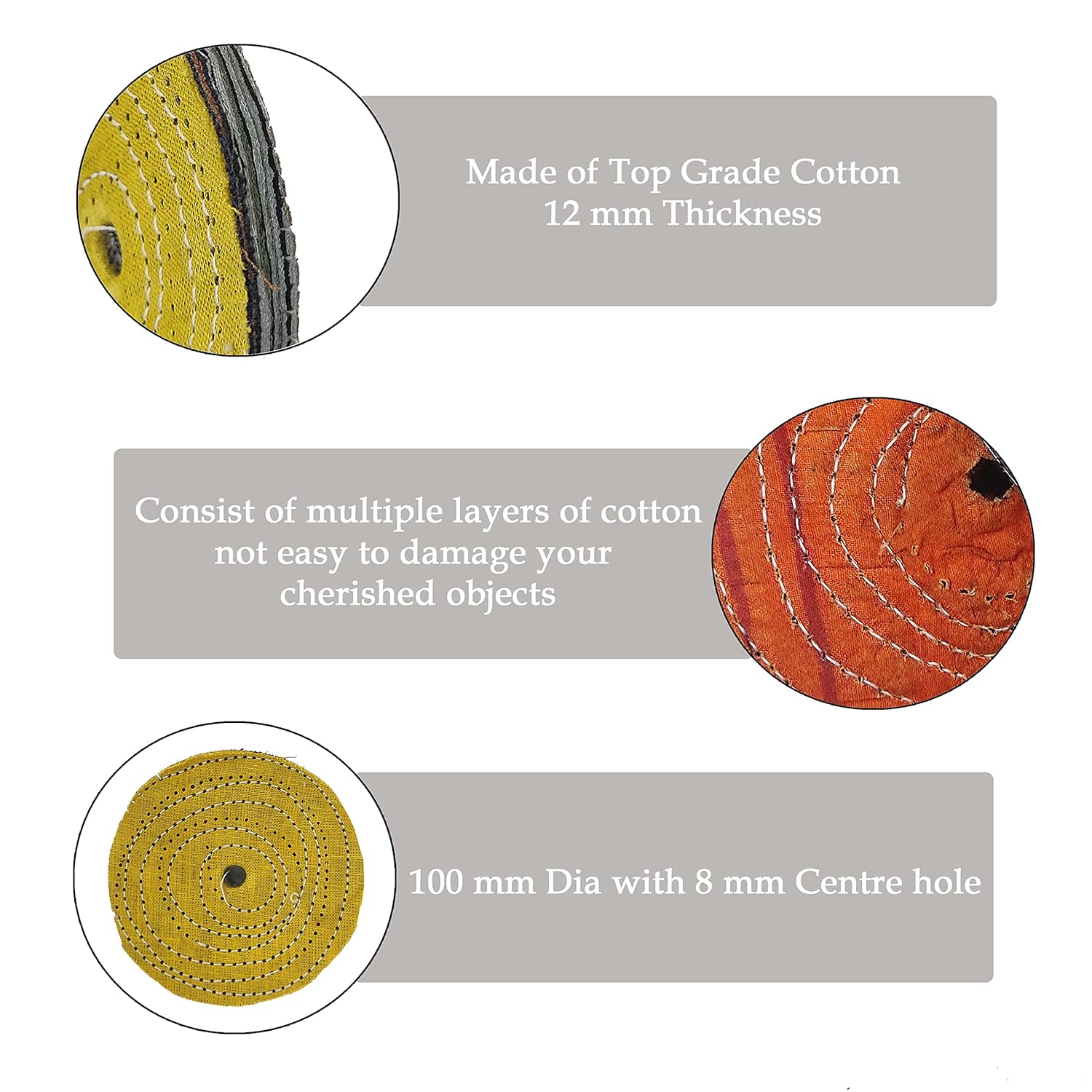 The polishing wheels are 8 mm center hole fits most bench grinder. The polishing wheels much thicker to last longer and provide larger surface area, Thick concentrically sewn circles design holds together more stiffly so greater pressure can be applied.