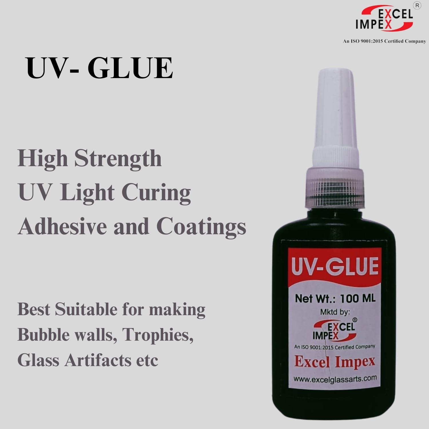Excellent bonding properties of UV Glue used for adhesion between Glass to Glass. UV Glues are bonded under ultra violet rays or strong sun light. Exceptional optical clarity and stability even in difficult environmental conditions.
